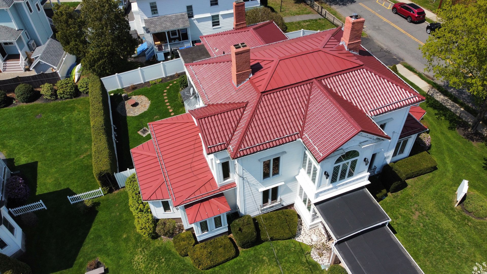 We later expanded the project to include matching Techno Tiles on the elegant porte-cochère, enhancing the building’s curb appeal and architectural charm. This Easthampton roofing project perfectly showcases how metal roofing can deliver both style and longevity—proving it’s always a beautiful day for a beautiful roof.